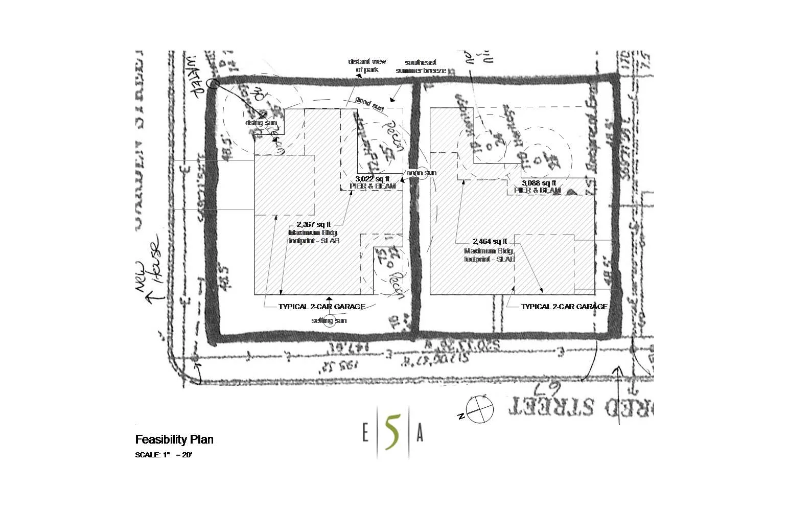 Relevant case study: E5A recently completed a feasibility study for a young couple looking to build their first home. They are perfectly suited for needing an architect – they are creative, value-driven people who understand the importance of good design and do not want to compromise quality just to have a larger house. In Austin, where home prices have soared through the roof, it’s often advisable to build your own house to exacting standards, customized to your particular lifestyle without a square foot of wasted space. In their case, we were able to narrow the focus for purchasing a lot to several neighborhoods and then evaluate a few properties suitable for their home size, lifestyle, solar orientation, utilities, and proximity to their interests. The accompanying Site Plan shows our analysis.