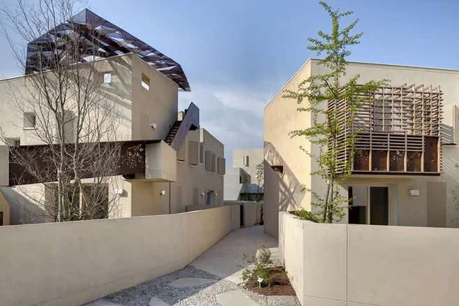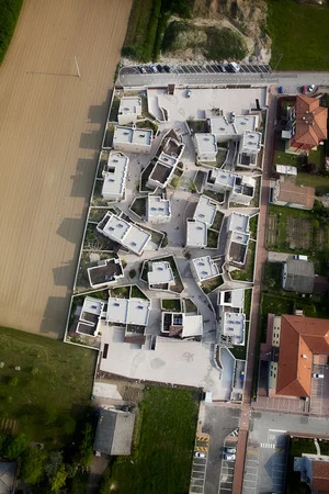 Another very interesting project is Contra Leopardi housing project in Treviso, Italy. Parking is isolated to the perimeter of the site so the buildings on the interior pathways are completely pedestrian. Furthermore, the buildings are laid out in a medieval fashion that is remeniscent of the Italian heritage and creates more interesting pedestrian streets and gathering spaces.